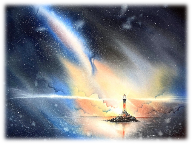 Closing her eyes so that she could hear more clearly the tone, she sensed a cord, delicate and blue, tied not to her finger but to the very pulse of her being. Stretching from her heart, luminous and fragile, winding through the undergrowth and climbing toward the sky, she followed it with a natural trust, her path opening before her as the trees thinned and gave way to the meeting place of land and sea. She followed its pull to a clearing where her mind’s eye flickered with a distant lighthouse.